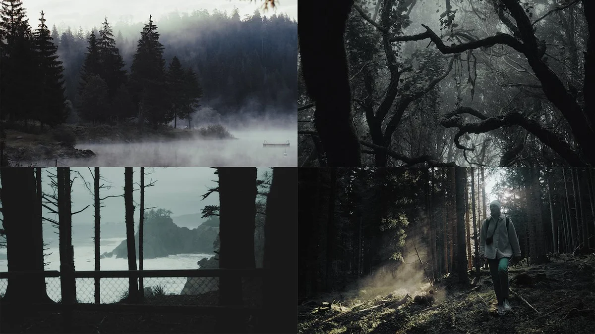 Envelop your footage in the deep, mysterious greens and earthy browns of an enchanted forest, creating an eerie and mystical atmosphere.