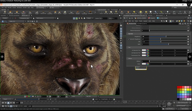 This 6-hour workshop begins with reference gathering before launching Houdini, where the scene is initially structured and basic shaders are applied. From there, Sohrab details the skin texturing workflow using Mari, from the initial setup through various stages of adding color, including how to use ZBrush for creating surface details. He also dives into the process of setting up realistic skin shaders in Arnold, within Houdini, and details how to approach complex fur patterns and designs using advanced layered, probability-based shading techniques.